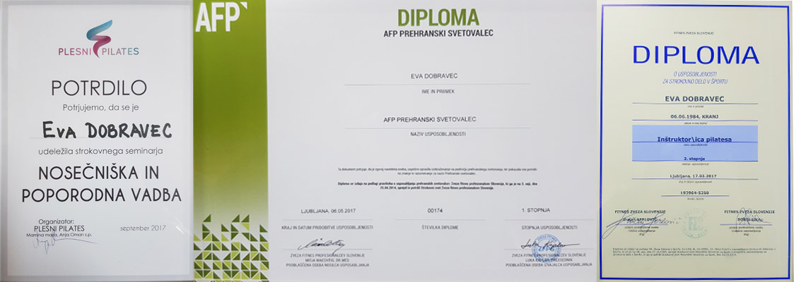 Zaradi lastnih zdravstvenih težav sem leta 2016 svoj ljubi hobi, vadbo pilatesa, začela spremenjati v svoj posel. Leta 2017 sem opravila tečaj pri Fitnes Zvezi Slovenije in postala Inštruktor pilatesa. Septembra istega leta sem odprla svoj lasten, prijeten, center Evalates v Lescah.